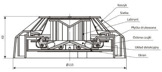 Najważniejszą częścią detektora jest układ detekcyjny. Składa się on z diody nadawczej oraz diody odbiorczej. Dioda nadawcza wysyła sygnał w postaci podczerwieni, natomiast dioda odbiorcza odbiera od niej sygnał podczerwieni. Jednak światło nie pada bezpośrednio na diodę odbiorczą. Komora pomiarowa otoczona jest labiryntem, dzięki czemu światło rozprasza się. Wnikający dym występujący podczas pożaru rozprasza promieniowanie wysyłane przez diodę nadawczą. Odbite światło zamieniane jest przez mikroprocesor z micro prądu na postać cyfrową a następnie analizowane przez układ scalony umiejscowiony we wnętrzu czujki dymu. Jeśli algorytm stwierdzi, że wystąpił dym sygnał o pożarze przesyłany jest do centrali alarmowej.